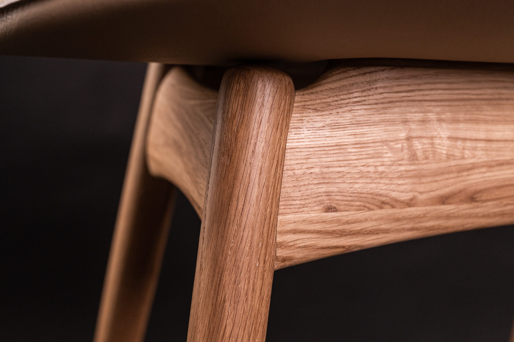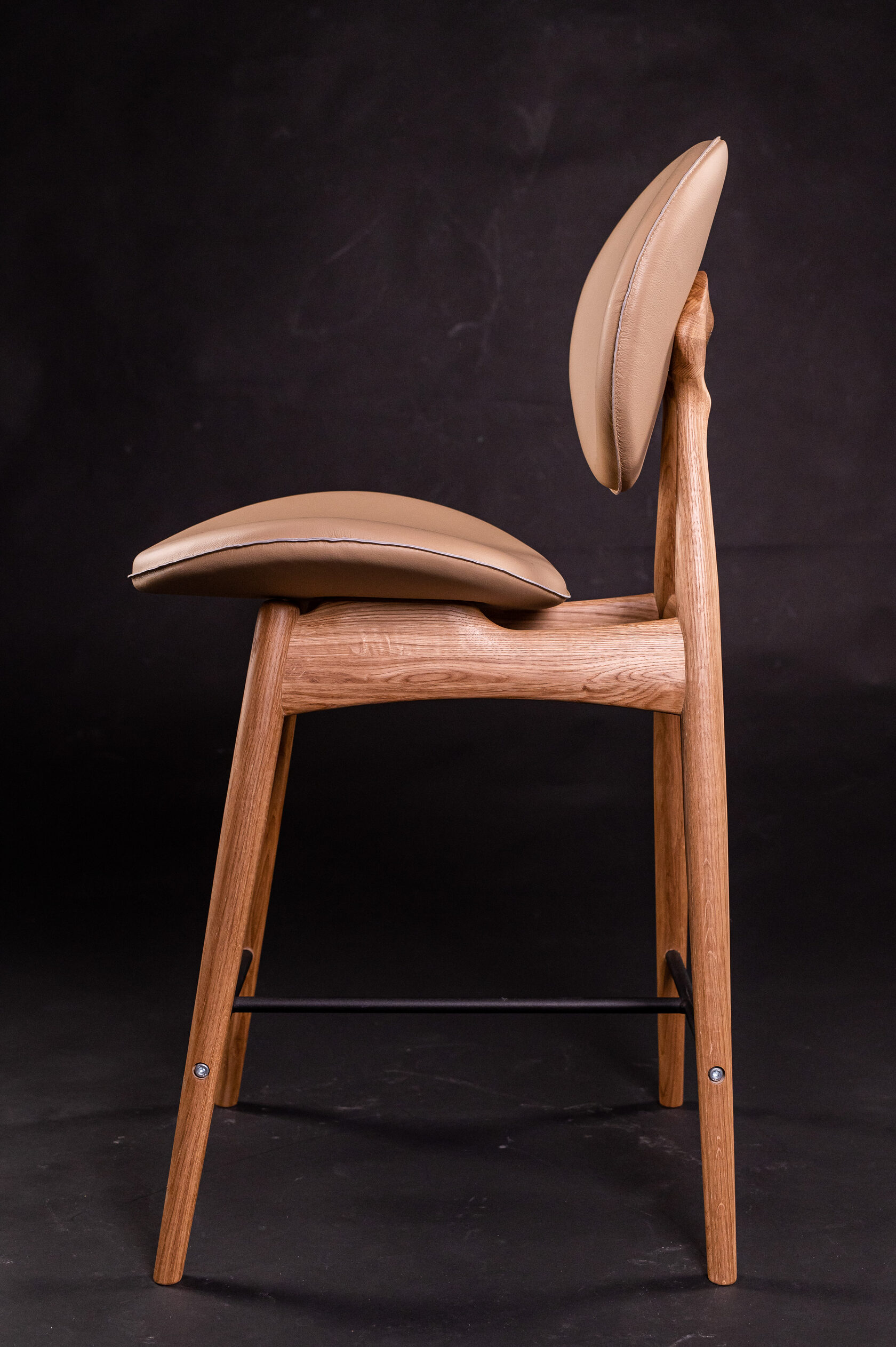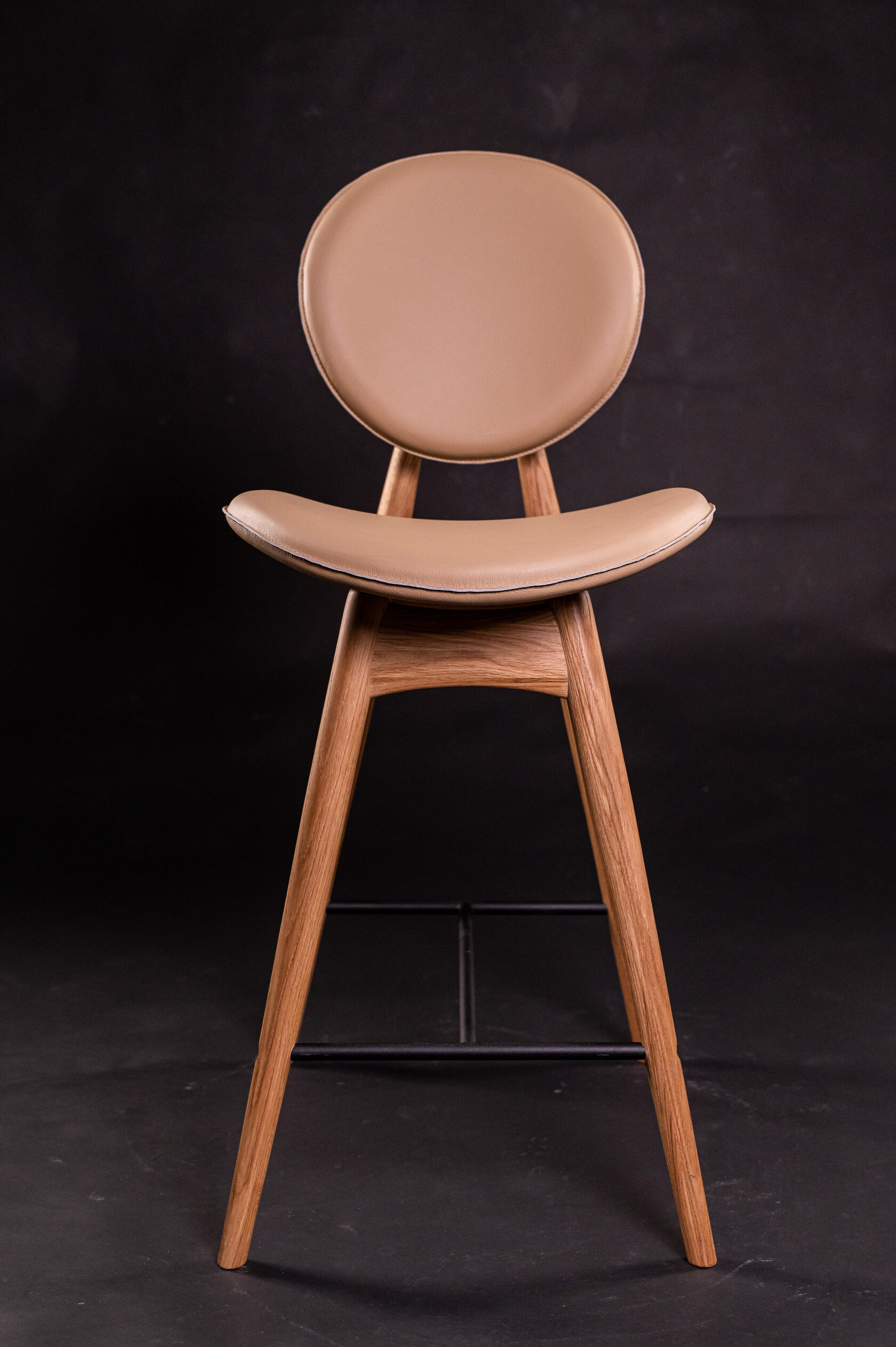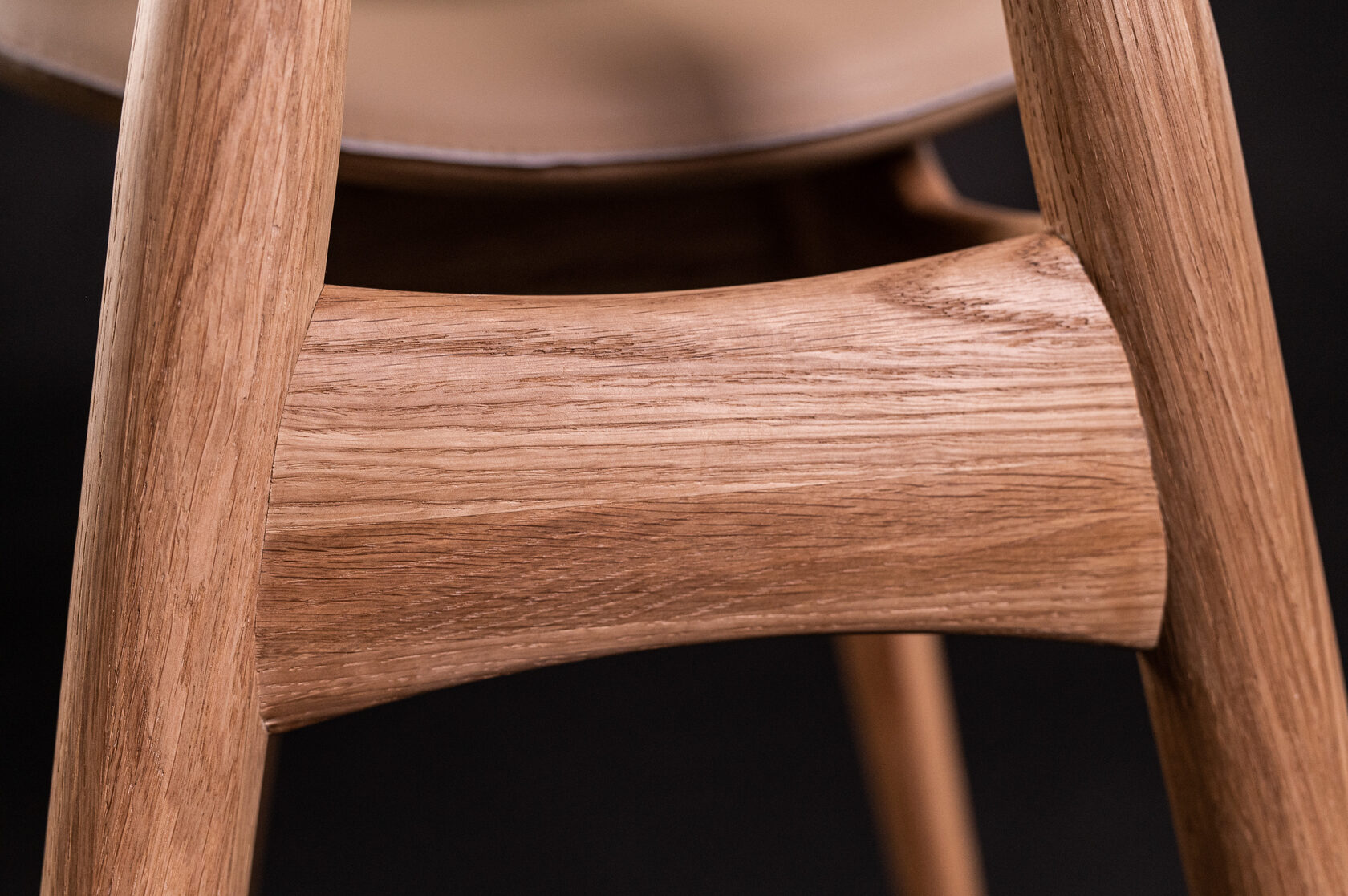 The OLD bar stool features a traditional, four legged base in tapered design. It is topped with a square seat that introduces tactility to the design. A footrest is integrated into the legs.