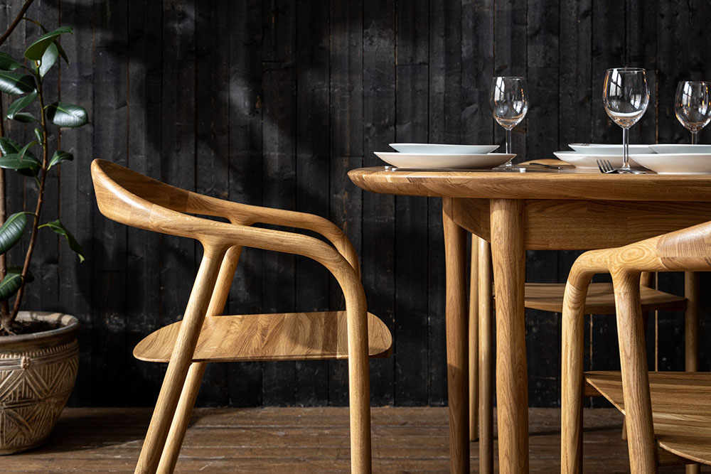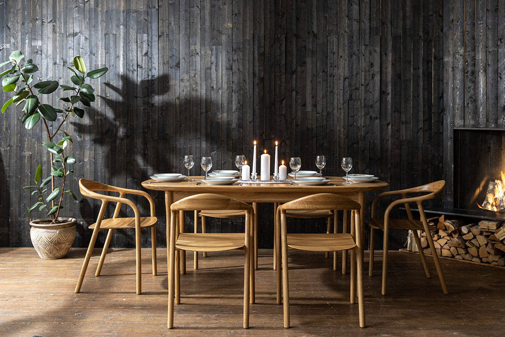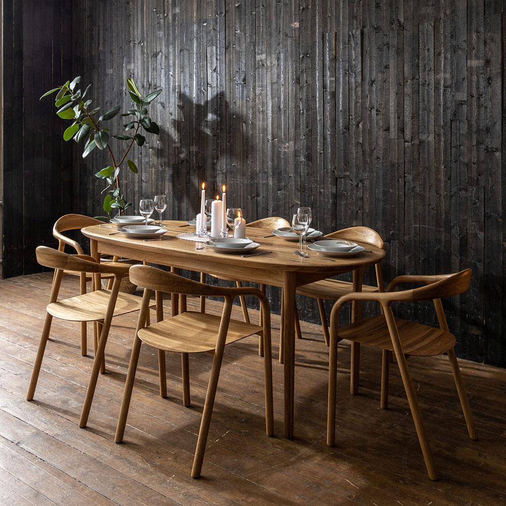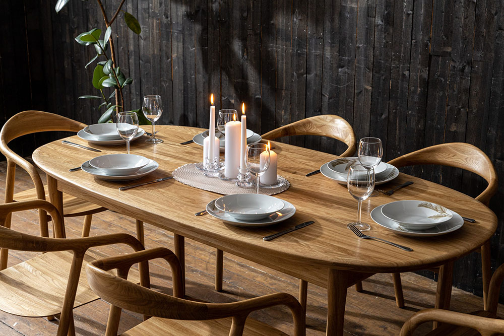 The Merano table features an oval solid oak top and solid oak rounded legs which elegantly taper toward the floor. It has a tactile simplicity with soft edges that makes bringing people together a delight. Designed for practical seating the base allows no interference